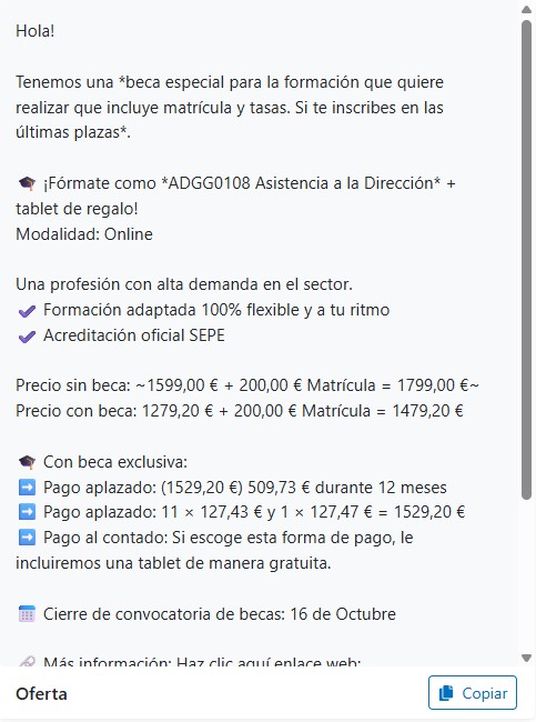La extensión genera mensajes adaptados a la lectura móvil: párrafos cortos, emojis estratégicos, negritas para destacar la información clave y enlaces clicables. Ideal para conversaciones ágiles, naturales y con alto nivel de respuesta.